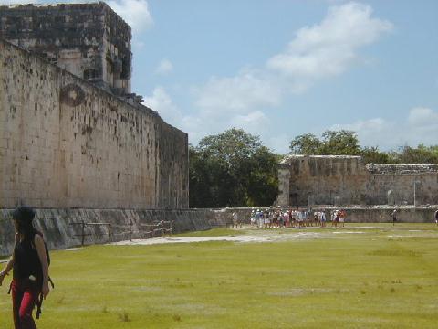 大球戯場の中を見る。左側壁の上部にボールを通したと思われる石の環がある