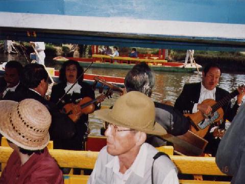 マリアッチを乗せた舟が水上で観光客を乗せた舟に横付けになって音楽を聞かせる