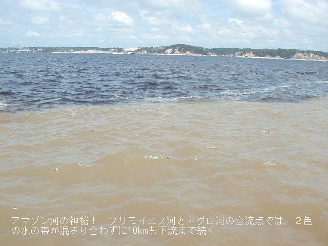 両岸をジャングルに囲まれたアマゾン河最大の支流ネグロ川と本流のソリモンエス川がマナウス市の東で合流する。ネグロ川の黒い色とソリモンエス川の黄土色の水は互いに混ざり合わずに10kmも下流まで二色の帯が続いていく。まさに奇観である。 |
