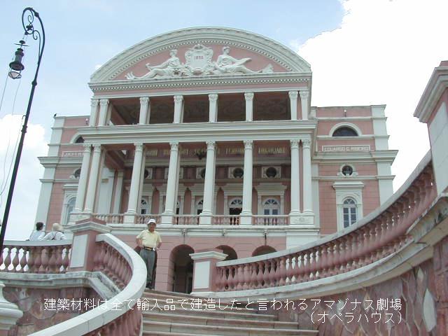 | 19世紀末、アマゾン河の上流で天然ゴムが発見され、これをきっかけに周りをジャングルに囲まれたこの町マナウスを中心に一大ゴムブームが巻き起こった。一攫千金を夢見た人々がヨーロッパから大挙して押し寄せてきた。 空前のゴム景気にわくマナウスは一躍ヨーロッパの社交場と化した。 |