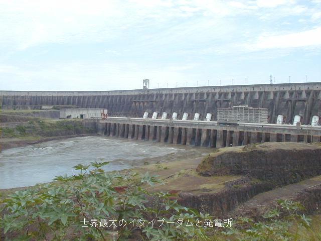 ブラジルとパラグアイの国境パラナ川に建造された「イタイプー」ダムと発電所は、建設に9年を要して1984年に完成した。ダムの長さ1406m、最高185m、貯水量2010億トンは,どれをとっても世界一である。ここで発電される1260万キロワットの電気の半分はパラグアイに所有権があるが、使い切れずにブラジルに売っている。 |